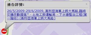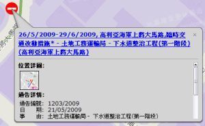 點擊地圖工程點後將彈出訊息視窗,使用者瀏覽該項通告之詳細訊息或連接至交通局相關網頁。 |